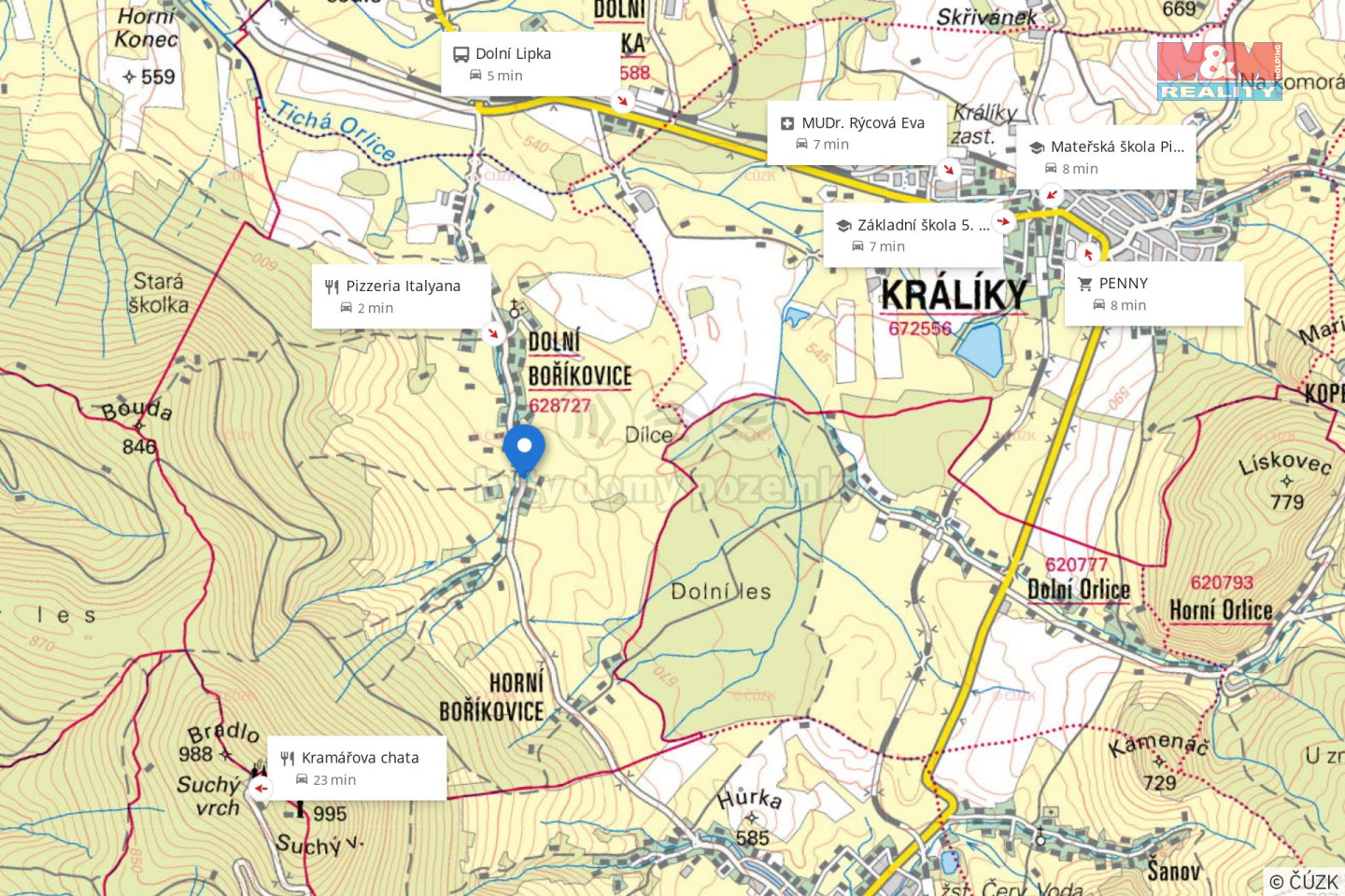 Nabízíme Vám ke koupi pozemek v obci Dolní Boříkovice - Králíky. Pozemek je složen ze dvou parcel o celkové ploše 1 731 m2, určen k výstavbě rodinného domu nebo chalupy. Pozemek hraničí s obecní komunikací. Na hranici pozemku je přivedena přípojka elektřiny a přípojka obecního vodovodu. V blízkosti se nachází velmi vyhledávané vojenské opevnění, Suchý vrch, vojenské muzeum Králíky, skiresort Dolní Morava, skiareál Červená Voda a Čenkovice. Pro více informací a domluvení prohlídky neváhejte kontaktovat makléře. S financováním Vám rád pomůže náš finanční specialista.
